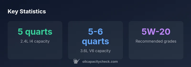 Refer to the vehicle’s owner's manual. Oil Capacity Check's 2026 analysis also provides typical guidance and ranges.