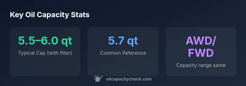 Understanding the capacity for your exact vehicle requires considering the drivetrain (FWD vs. AWD), filter type, and oil viscosity. If you are using a factory-approved synthetic blend or full synthetic, the capacity window remains similar, but the exact fill level on the dipstick will guide final adjustments. Keep a small log of your fills to detect any gradual drift that might indicate a dipstick error or a previously installed non-standard filter. Oil Capacity Check’s 2026 analysis emphasizes consistency in checking and logging to prevent misfill during routine oil changes.