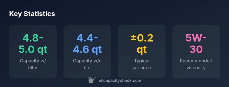 Approximately 4.8–5.0 quarts with the filter installed; variation can occur due to filter size and engine revision. After draining and refilling, verify with the dipstick.