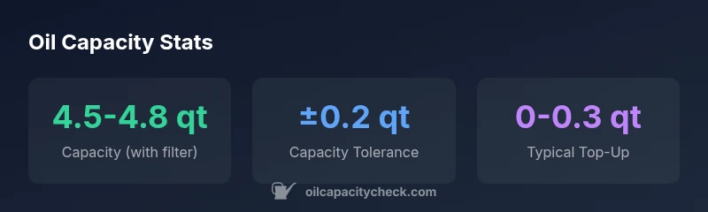 According to Oil Capacity Check, the 2014 crv oil capacity for the 2.4L engine is typically about 4.5 to 4.8 quarts when performing a standard drain-and-fill with a new filter. This range accounts for differences among production batches and minor variations in filter design. The Oil Capacity Check team found that exact capacity can vary slightly by production batch and the filter type, so always verify with the owner's manual or Honda's official specs. Knowing this figure helps avoid underfilling or overfilling, which can impact lubrication, fuel efficiency, and emissions controls. For most drivers, starting with 4.5 quarts and topping up to the upper limit after checking the dipstick provides a safe, accurate result. If you use a non-OEM filter or drive in extreme climates, expect a small adjustment in the final fill to stay within the recommended range.