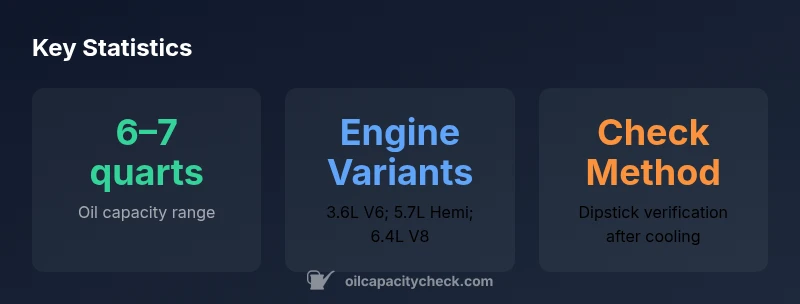 The oil capacity depends on the engine: about 6 quarts for the 3.6L V6 and around 7 quarts for the 5.7L and 6.4L V8 variants, including the oil filter.
