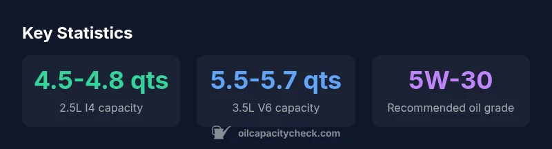 For the 2.5L engine, expect about 4.5-4.8 quarts with a new filter. The 3.5L engine requires roughly 5.5-5.7 quarts. Exact figures depend on the engine and filter choice; verify with the owner's manual and dipstick.