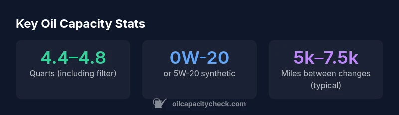 The capacity is typically 4.4–4.8 quarts with the filter installed. This range accounts for filter variation and dipstick placement. Always confirm with the service manual.