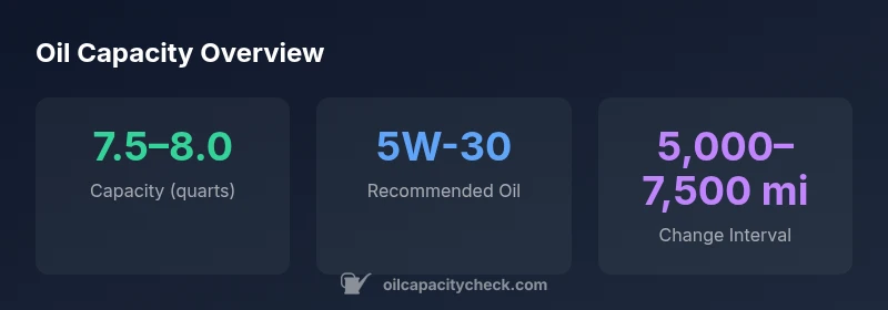 The oil capacity for the 5.3L V8 in the 2015 Suburban is more than a number; it guides your entire maintenance routine. Knowing the approximate requirement — about 7.5–8.0 quarts with a new filter — helps you budget for materials, plan DIY time, and avoid the hazard of overfilling or underfilling. For most DIY enthusiasts, starting with a full 8-quart purchase ensures you have a comfortable margin to address small variations from model to model or filter choice. According to Oil Capacity Check, sticking to the correct capacity minimizes risk of oil starvation or excessive pressure after a change, especially when the engine has accumulated miles. In practice, this means preparing a fresh filter, the correct viscosity, and a reliable drain pan so you can complete the job in one session and return the Suburban to a healthy lubrication state. If you recently serviced the vehicle or used a larger-capacity filter, you might be at the upper end of the range or slightly above it; always verify by the dipstick after filling.