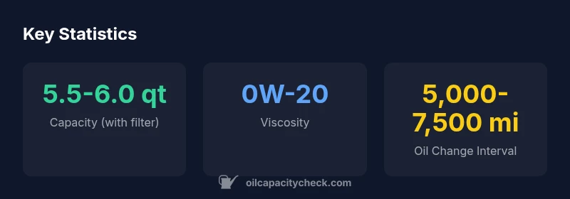Most sources place the capacity around 5.5-6.0 quarts with a new filter. Always confirm with the manual and dipstick after a change.
