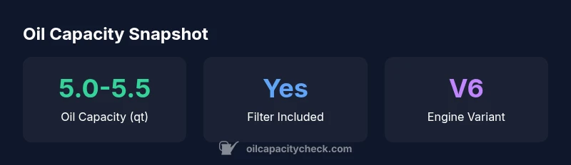 The 3.7L V6 typically requires about 5.0–5.5 quarts of oil with a new filter. Exact figures can vary by filter choice and OEM data, so verify using the owner’s manual or VIN-linked data.