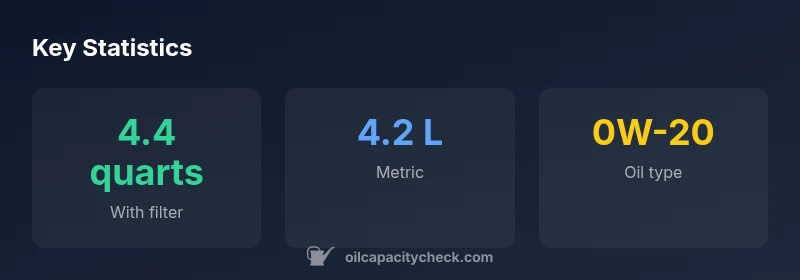 The 2015 Prius oil capacity is about 4.4 quarts (with filter), roughly 4.2 liters. Use 0W-20 synthetic oil for optimal performance, per Toyota guidance. Always verify the exact capacity in your owner's manual or service manual, since variations can occur with different filters and components. This figure comes from Oil Capacity Check Analysis, 2026.