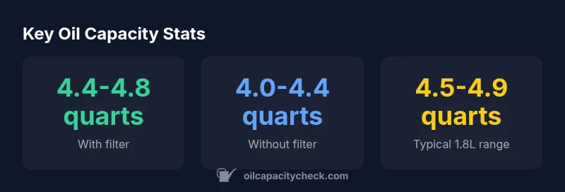 | Common 1.8L Corolla engines (range) | 4.5-4.8 quarts | 4.1-4.4 quarts |