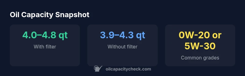 | Common oil grade (recommended) | 0W-20 or 5W-30 | Check manual |