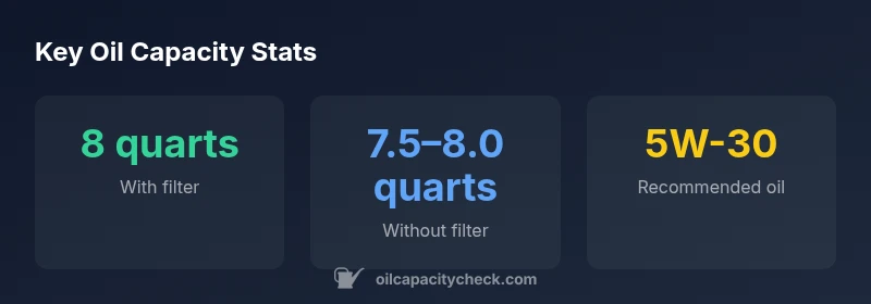 Typically about 8 quarts with a filter. Always confirm with the owner's manual and dipstick after a drain-and-fill.