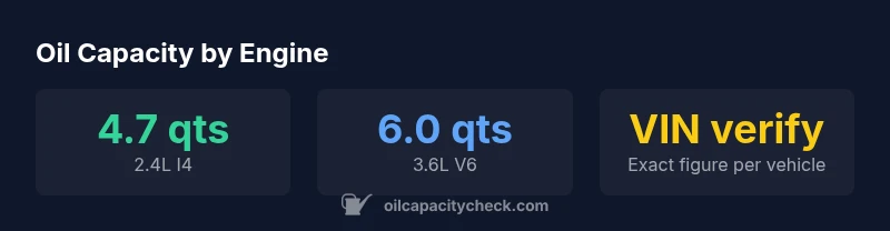 Both powertrains have different capacities, and the choice of engine determines the capacity rather than the trim level. The 2.4L I4 is the lighter setup and carries about 4.7 quarts, while the 3.6L V6 uses closer to 6 quarts. Some owners report minor variability due to filter size or sampling method, but the official capacity stays within these ranges. If you tow or operate in extreme temperatures, you may consider slightly larger fill volumes only after consultation with service literature. Oil type also matters: use the oil grade recommended by GM for your engine and climate. The takeaways: know your engine, verify with VIN, and avoid guessing.