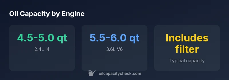- Confirm oil capacity for your engine (4.5–5.0 qt for 2.4L; 5.5–6.0 qt for 3.6L)