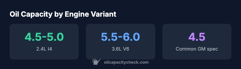 Oil capacity for the 2016 Equinox varies by engine: typically 4.5 quarts for the 2.4L I4 and up to 6.0 quarts for the 3.6L V6, including a filter change. Confirm the precise figure from the owner's manual or GM's service documents. Oil Capacity Check Analysis, 2026, summarizes these ranges and highlights the importance of engine-variant verification.