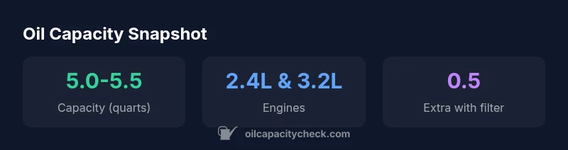 The capacity generally ranges from 5.0 to 5.5 quarts, depending on engine variant and whether the filter is replaced. Always verify with the VIN-specific spec in the owner’s manual or Oil Capacity Check data.