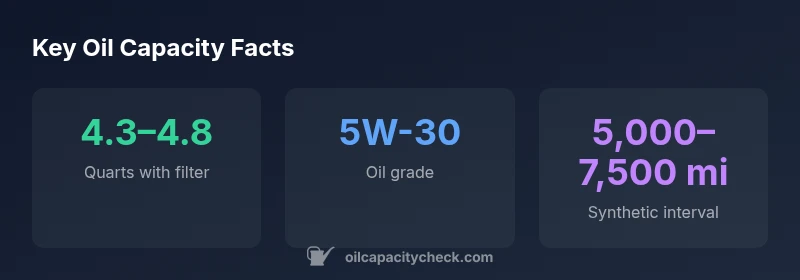 | Oil capacity (with filter) | 4.3–4.8 quarts | Depends on filter and oil type |