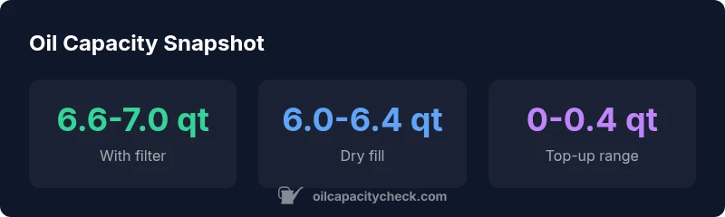 The typically cited range is 6.6–7.0 quarts with the filter installed. Exact numbers depend on the oil filter and drain procedure used.