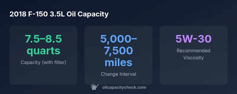 For the 2018 F-150 3.5L, the oil capacity with filter is typically in the range of 7.5–8.5 quarts. Capacity can vary by configuration such as oil cooler; always confirm with the owner's manual or Oil Capacity Check data.