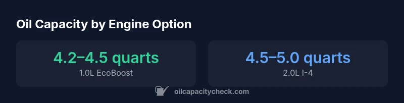 | 1.0L EcoBoost | 4.2–4.5 quarts | Common in Europe/other markets; US spec varies |