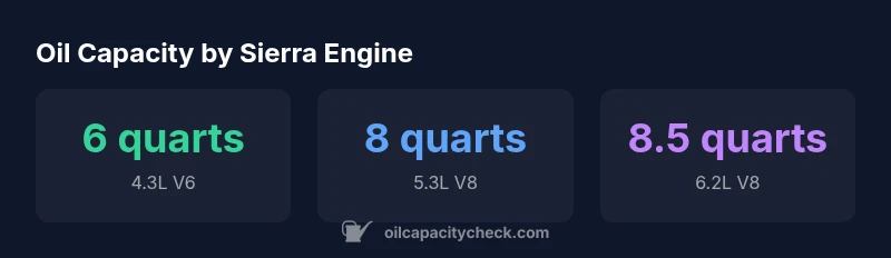 Oil capacity for the 2018 GMC Sierra 1500 varies by engine: about 6 quarts for the 4.3L V6, roughly 8 quarts for the 5.3L V8, and around 8.0–8.5 quarts for the 6.2L V8, including the filter. This includes the filter; always verify exact figures using your VIN and the owner's manual.
