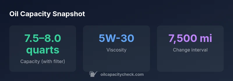 The figure above accounts for the common scenario of a fresh fill with filter replacement. Minor deviations can occur due to filter size, drain method, or service procedures. Car owners should treat the 7.5–8.0 quart range as a practical starting point and verify with OEM sources tied to their specific VIN.