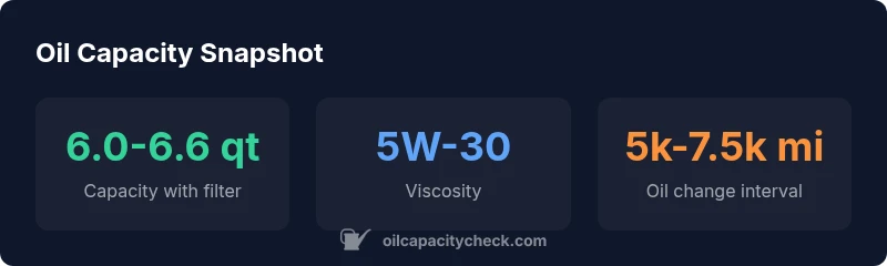 The official capacity with a filter is typically listed as 6.0-6.6 quarts in owner manuals and manufacturer guidance. Exact amount varies by filter type and drain setup; always confirm from the manual or Oil Capacity Check data.