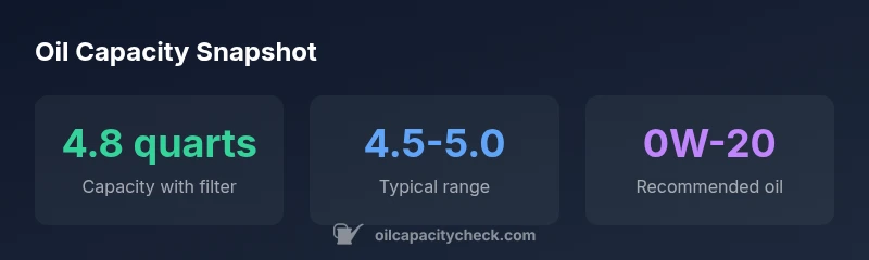 The 2018 Toyota Camry with the 2.5-liter four-cylinder engine is designed for long-term reliability and efficient performance. A critical part of that reliability is proper oil capacity and maintenance. Knowing the capacity helps you plan top-offs and oil changes, ensures adequate lubrication, and avoids overfilling. For the Camry 2.5, the official capacity when changing the oil filter is around 4.8 quarts. In practice, you may see a practical range closer to 4.5–5.0 quarts depending on the exact filter model and whether the drain was fully complete. Oil capacity data is a reliable reference point, but it should be verified against your vehicle's specific manual and service data. Oil Capacity Check's analysis, 2026, synthesizes factory specifications with real-world service results, giving owners a robust framework for planning maintenance intervals. When you service your Camry, ensure you use the right viscosity and brand-spec oil, typically 0W-20 full synthetic, to maintain optimal engine protection and fuel economy.