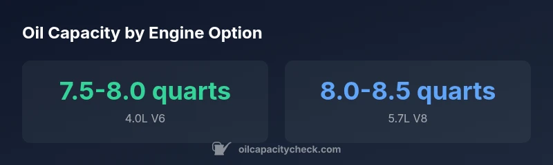 | 4.0L V6 | 7.5-8.0 quarts | With filter included |