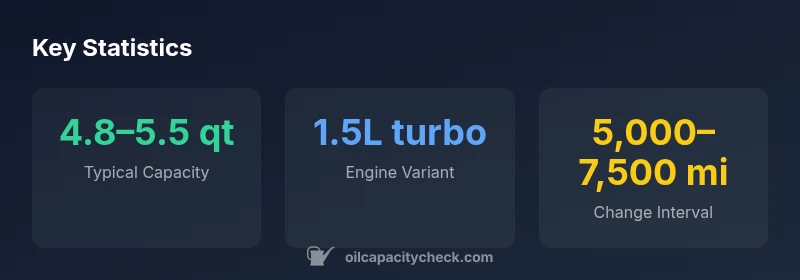 The 1.5L turbo typically holds about 4.8–5.0 quarts when performing an oil change with a new filter. Always verify against your exact engine code in the owner’s manual and your VIN data, as some variations may apply.