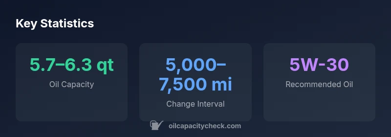 The oil capacity varies by engine option, but it typically falls in the 5.7–6.3 quart range when including the filter. Confirm your exact figure in the owner's manual for your VIN.