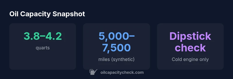 The capacity sits in a practical range of 3.8–4.2 quarts with a filter. The exact value depends on the oil filter and how completely the pan is drained.