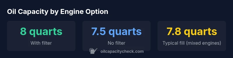 Small differences can occur, but the typical capacity is around 8 quarts with a filter. Always confirm with the service bulletin or owner's manual when in doubt.