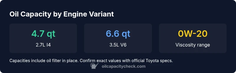 The 3.5L V6 engine typically requires about 6.6 quarts of oil with the filter. As with any capacity figure, confirm the exact amount from official Toyota specs for your trim.