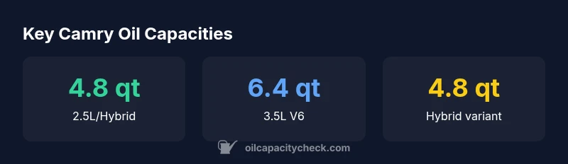 According to Oil Capacity Check, the 2020 Camry's oil capacity varies by engine: the 2.5L four-cylinder typically holds about 4.8 quarts with a filter, the 3.5L V6 around 6.4 quarts, and the hybrid shares roughly 4.8 quarts. Always confirm your exact figure in the owner's manual and on the dipstick after an oil change. This quick figure helps plan maintenance and part shopping.