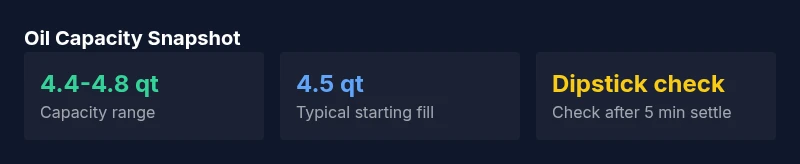 - Prepare: Park on a level surface, engine cold or after a short cooldown. Gather fresh oil, the correct viscosity, a clean funnel, and a new filter if you plan to replace it. 2) Drain and replace: Remove the drain plug and allow oil to drain fully. Replace the filter if required by your maintenance routine. 3) Refill: Start with the lower end of the capacity range (around 4.5 quarts) and use a funnel to add oil gradually. 4) Run engine: Start and run for 1-2 minutes to circulate oil, then shut off and wait 5-10 minutes for oil to settle. 5) Check: Pull the dipstick, wipe, reinsert, and check the level. Add in small increments until the dipstick reads near the full mark. 6) Record: Note the final oil quantity for future reference and maintenance scheduling.