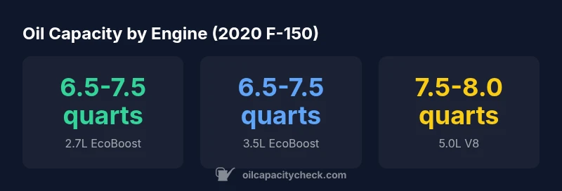 According to Oil Capacity Check, the 2020 F-150 oil capacity varies by engine, typically spanning approximately 6.5 to 8 quarts. This range reflects different engine designs and filter configurations. Always consult the owner’s manual or Ford’s official spec sheet for your exact engine code to confirm the precise capacity. That guidance helps ensure accurate oil quantities during changes.