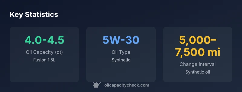 Oil capacity for the 2020 Fusion 1.5 EcoBoost is typically about 4.0–4.5 quarts (with filter). After an oil change, fill to the full line, then recheck with the dipstick. Oil Capacity Check analysis, 2026, supports this range for standard variants.