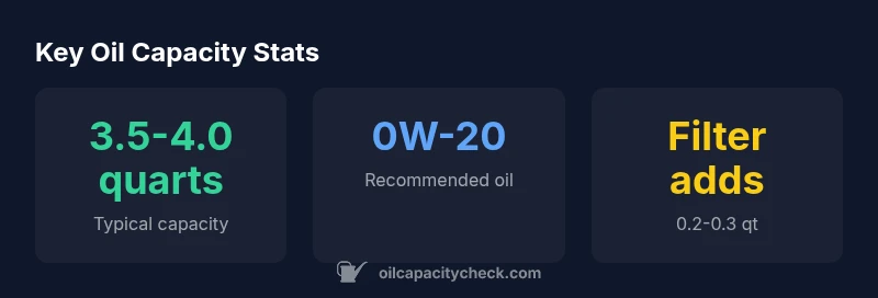 ["Plan for a 3.5-4.0 quart capacity as a baseline.","Include the oil filter in total capacity when changing oil.","Use 0W-20 full synthetic where recommended.","Verify oil level with the dipstick after every service."]