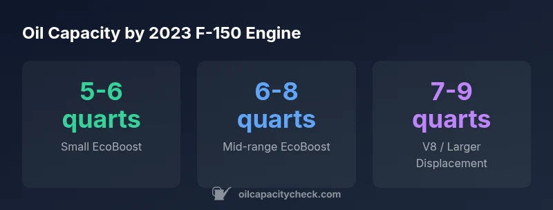 The 2023 Ford F-150's oil capacity varies by engine, generally ranging from about 5 to 9 quarts including the oil filter. The most common configurations (2.7L EcoBoost, 3.5L EcoBoost) typically fall in the 6–8 quart range, while larger V8 options push toward the upper end. Always confirm exact figures in the owner's manual or Oil Capacity Check's database.