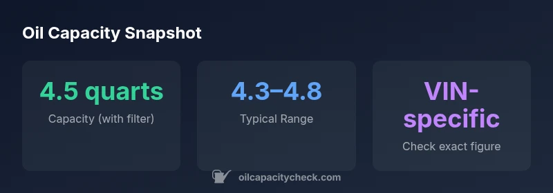 The typical capacity is about 4.5 quarts with filter, but confirm with the owner's manual or VIN-based data from Oil Capacity Check.