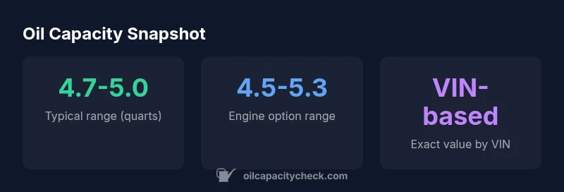 “Oil capacity figures for modern engines can vary slightly by engine family, production date, and filter design. Always verify with VIN-specific data and the owner's manual for accuracy.”