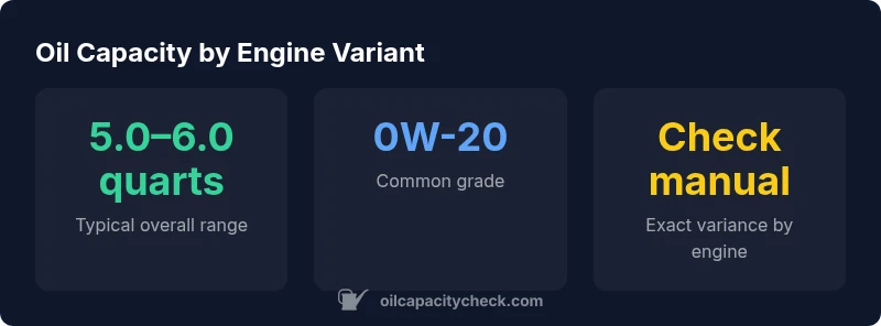 Capacity varies by engine; typical range is 5.0–6.0 quarts with filter. Always check the owner’s manual for the precise figure.