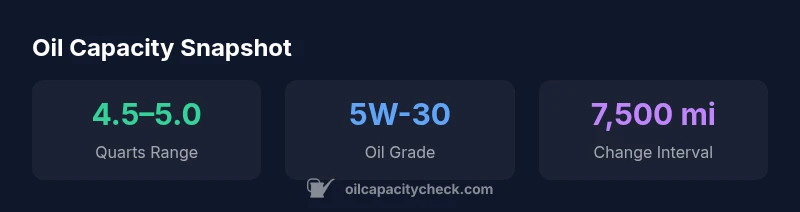 | Oil capacity (quart range) | 4.5–5.0 quarts | Engine and filter dependent |