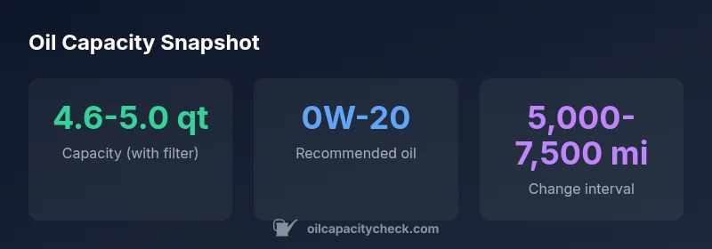 The oil capacity of an engine is not just a number on a spec sheet; it directly affects lubrication, cooling, and wear protection. For the 2ZR-FXE, the capacity you’ll need during a standard oil change with a new filter sits in a fairly tight range, with most cases landing around 4.6–5.0 quarts. This range accounts for the typical filter size, drain duration, and small manufacturing variances between model years. Oil Capacity Check’s 2026 analysis shows that staying within this band helps ensure the engine’s bearings and valve trains receive consistent lubrication during heat cycles and heavy loads. If you overfill or underfill, you risk increased oil consumption, foaming, or reduced oil pressure. Always double-check the capacity for your exact configuration before starting the change, and rely on precise measurement using a clean, calibrated dipstick after warm-up.