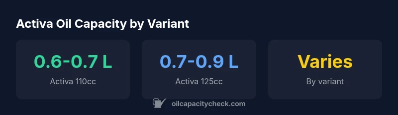 Yes. Activa engine oil capacity generally falls in a 0.6–0.9 L range, but the exact figure depends on the variant and year. Always verify with the official manual or service data for your specific model.