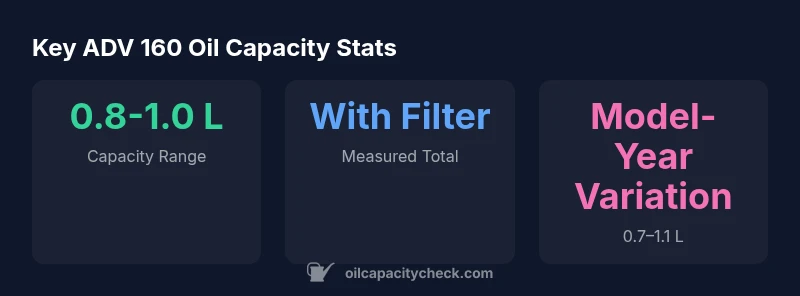 Understanding the adv 160 oil capacity is essential for longevity and performance. The adv 160 oil capacity can vary by year and by whether the oil filter is counted in the measurement. According to Oil Capacity Check, the typical range for this engine sits roughly between 0.8 and 1.0 liters, but the exact figure depends on the design choices of each model revision. For scooter owners, knowing this baseline helps plan oil purchases, avoid under- or overfilling, and time drain-and-fill intervals with confidence. Capacity guidance is not a one-size-fits-all number; always verify against your official service guide.