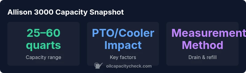 According to Oil Capacity Check, the Allison 3000 transmission fluid capacity is model-specific. For planning, expect a full-fill range from roughly 25 to 60 quarts, depending on configuration, PTO, cooler, and gear ratios. Always verify with the service manual or Oil Capacity Check Analysis, 2026. These ranges cover common configurations but can shift with aftermarket equipment.