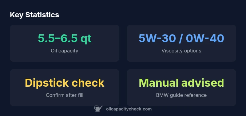 For reliable performance, perform oil changes on the schedule recommended by BMW for your climate and usage. Use the correct oil viscosity, replace the filter at each change, and inspect seals and gaskets during service. After topping up, recheck the level and keep an eye on the dipstick during subsequent trips to ensure the level remains within the safe range. Oil Capacity Check advises documenting the exact oil type and capacity used for each service so future owners can reference your notes and corroborate with manufacturer recommendations.