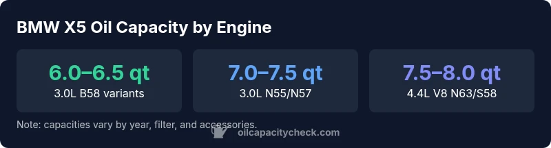 According to Oil Capacity Check, the BMW X5 oil capacity varies by engine and generation, typically ranging from about 6.0 to 8.0 quarts (5.7 to 7.6 liters) for a full oil change. Always verify with your owner's manual or service data for your exact model year and engine. This quick guide highlights common ranges and practical maintenance tips for 2026.