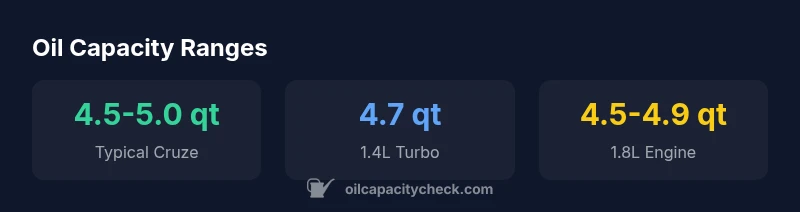 The Chevrolet Cruze oil capacity varies by engine, but most gasoline Cruze models require roughly 4.5 to 5.0 quarts of engine oil when performing an oil change with a new filter. For the exact figure, consult your owner's manual or service data. The keyword here is chevrolet cruze oil capacity, which changes with engine type and generation.