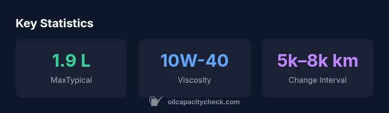 - Oil capacity (typical): 1.6–1.9 L